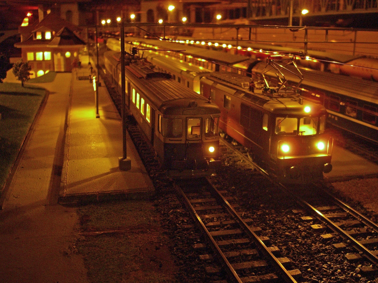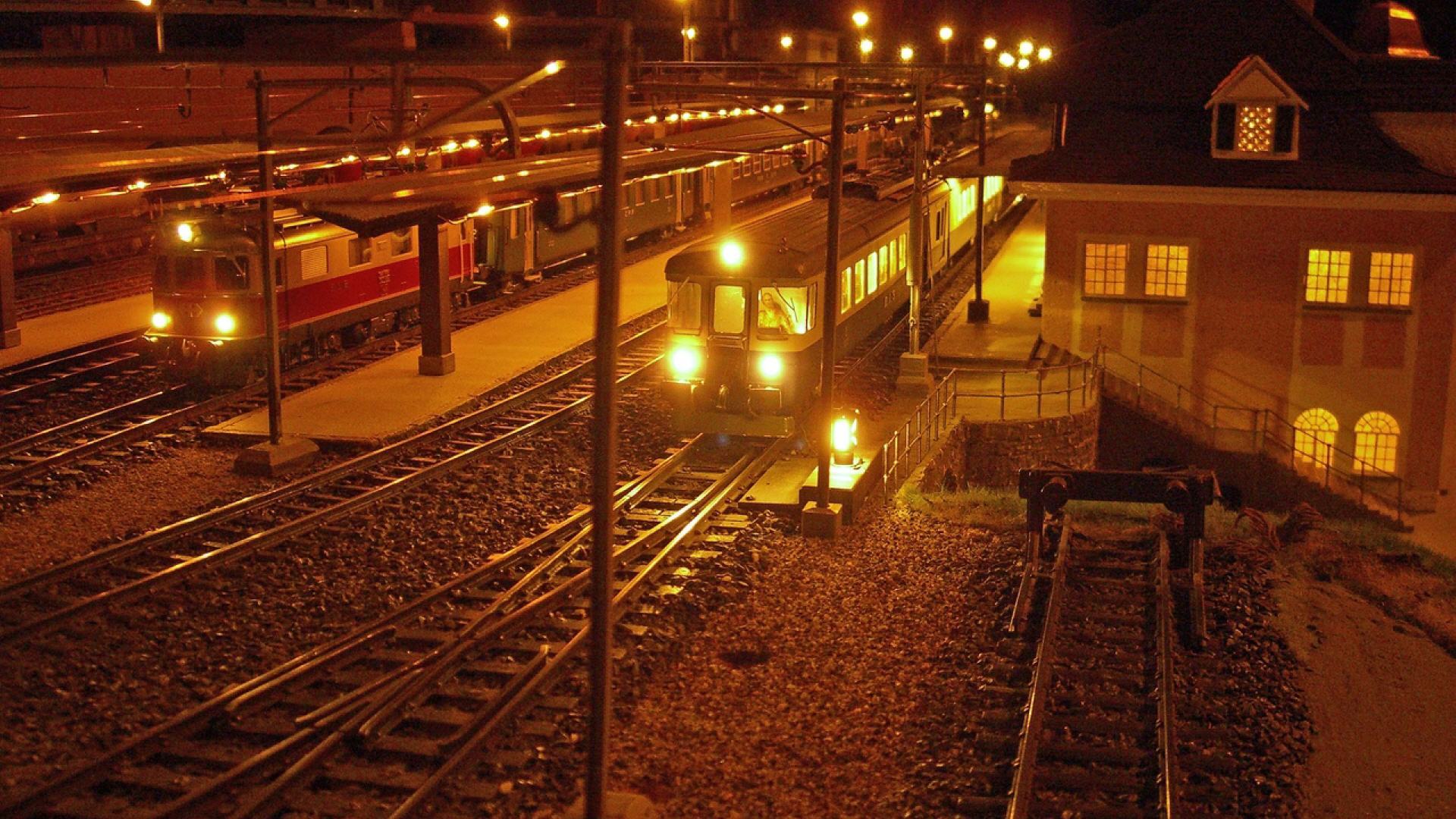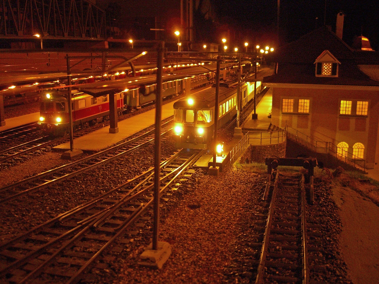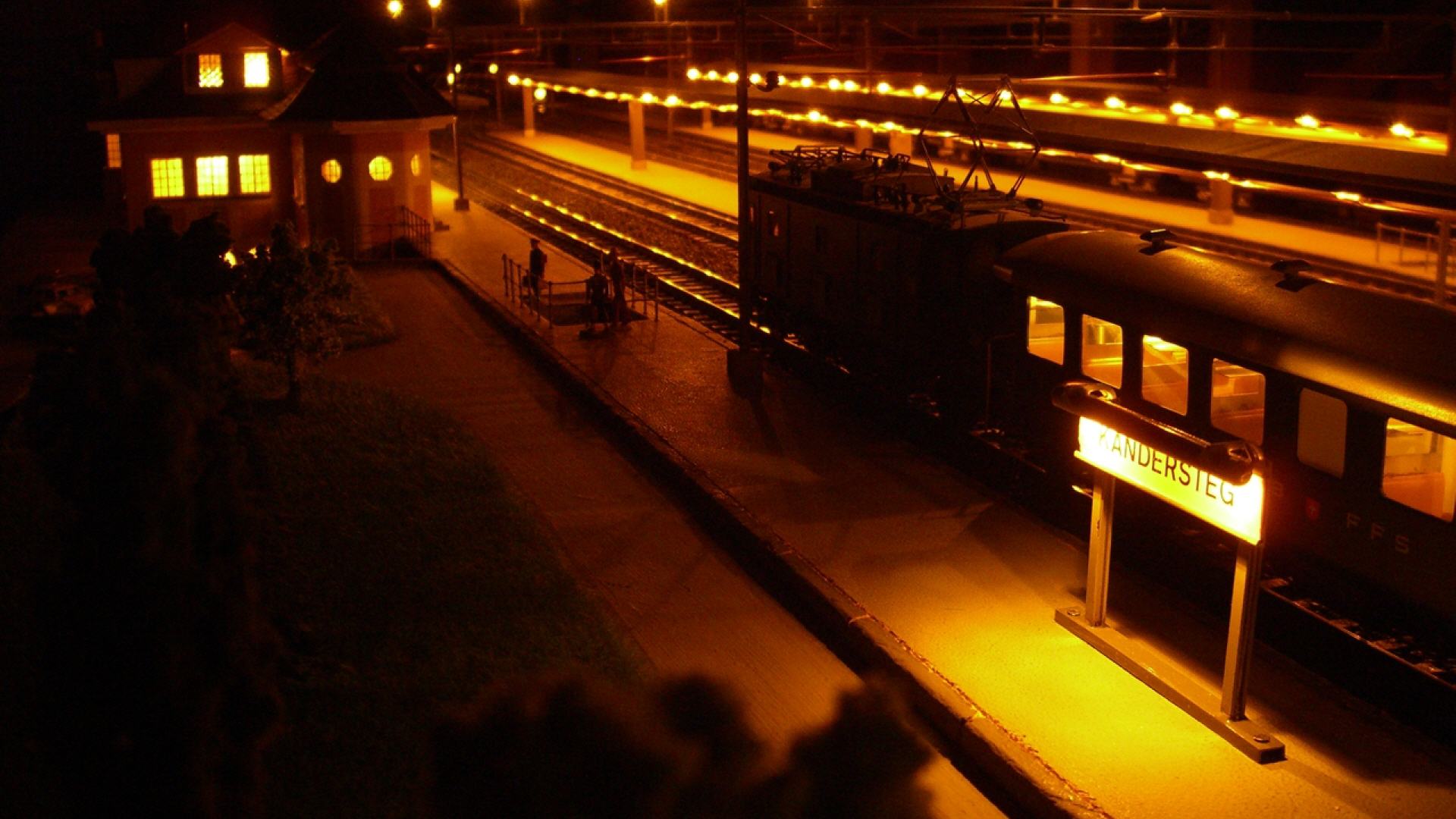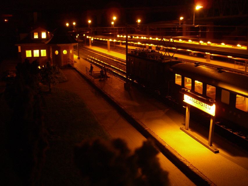Kandersteg aus den 60er Jahren ist wieder auferstanden. Die Anlage läuft mit echtem Oberleitungsbetrieb. Das ganze Areal, d.h. Gleise, Unterbau (Holz), Weichen, Oberleitungsmasten, stammen aus der "Morgensonne".